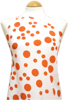 水玉模様 L1506 生地の種類: コチーボ 素材: ポリエステル 幅: 150cm 色: 白・オレンジ 柄の大きさ: 約 1.9cm/3.6cm 質感: やわらかく、シワになりにくい 用途: バイレ全般 販売価格: 15.50€ (2023円) |